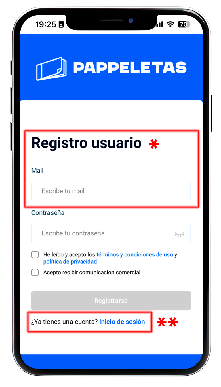 * Si es la primera vez que accedes a la aplicación tienes que registrarte para acceder a tus Pappeletas.